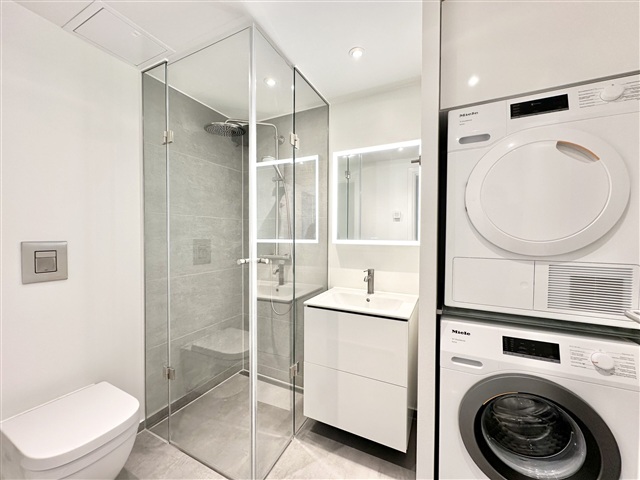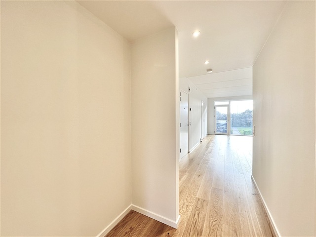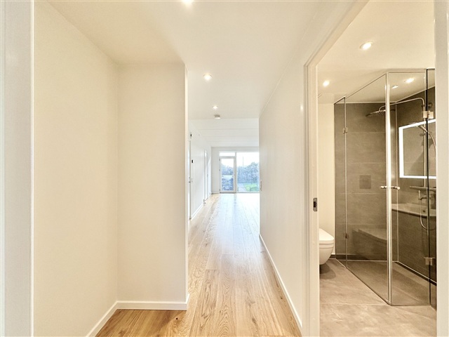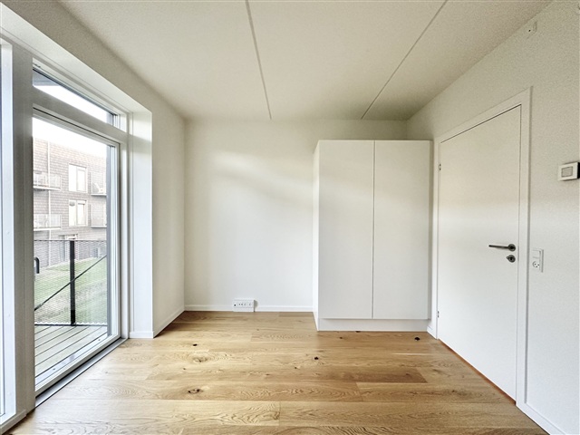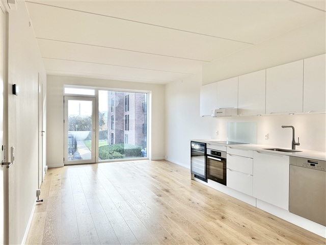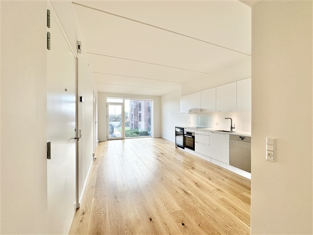 Situated on Roesskovsvej in Odense within the Christians Park area, this 64 m² two-room apartment offers access to the expansive and beautiful 24,000 m² Pulspark, along with a lovely terrace leading out from the unit. Upon entering, there is a welcoming hallway spacious enough to accommodate outerwear and footwear.The bathroom features elegant tiled surfaces, a shower enclosure, and fixtures from Grohe, complemented by Duravit bathroom furniture. Additionally, the apartment includes its own washer and dryer. A generously sized bedroom is equipped with built-in wardrobes and provides entry to a large balcony. The kitchen and living room are seamlessly connected, forming one expansive space. Positioned at one end of this bright room, the kitchen boasts floor-to-ceiling windows that bathe the interior in natural light. Finished in matte white from Designa, the kitchen includes a sleek Corian countertop. All major appliances are stainless steel, supplied by Miele, and there is also a wine cooler for added convenience.