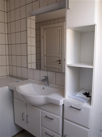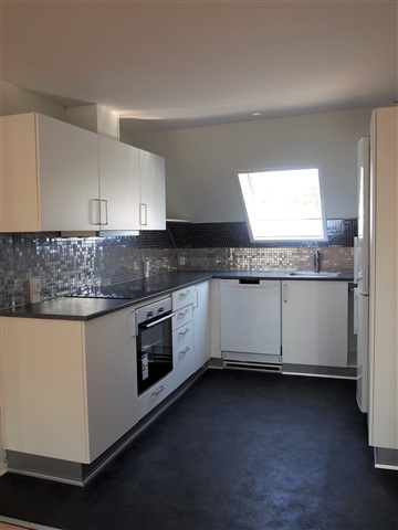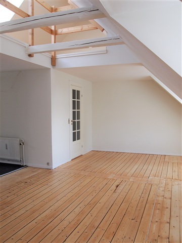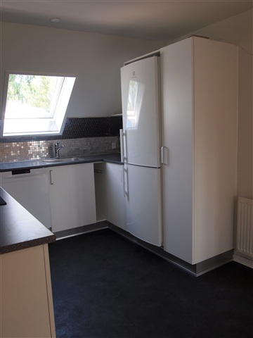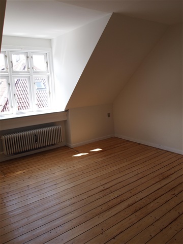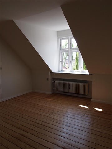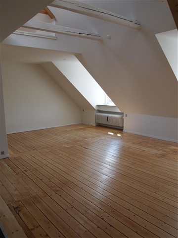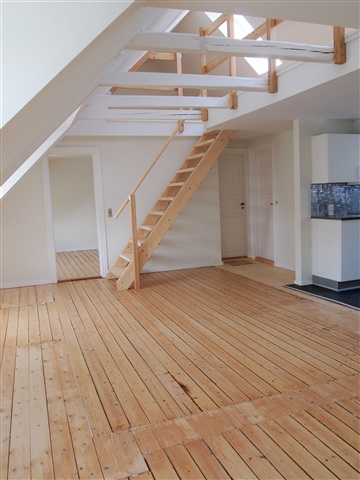 This recently renovated attic apartment features a mezzanine level. The kitchen is equipped with white Kvik cabinetry and includes all necessary appliances such as a fridge-freezer combination, a ceramic cooktop, a built-in oven, and a dishwasher.The living room is spacious and provides access to the large mezzanine area. In addition, the apartment contains a bedroom, an extra room, and a generously sized bathroom.