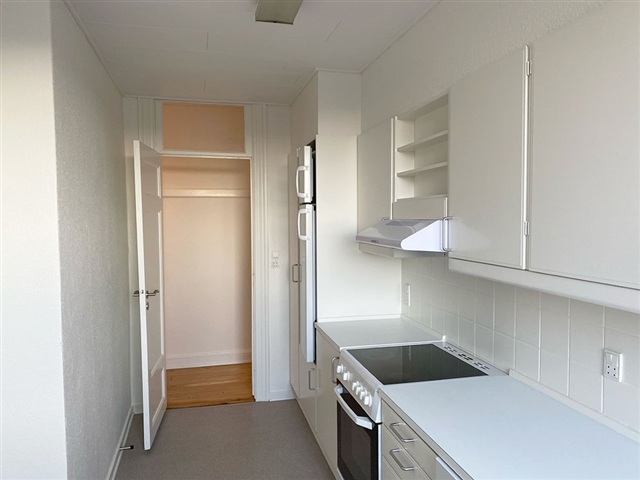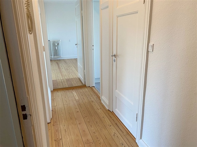 This 3-room apartment welcomes you with a lovely long hallway and planed floors. The hallway branches out to 4 of the apartment's 5 rooms. First comes a spacious bathroom with a cabinet arrangement next to the sink, a round mirror and good lighting via ceiling lighting.