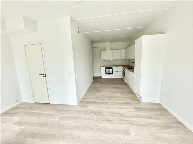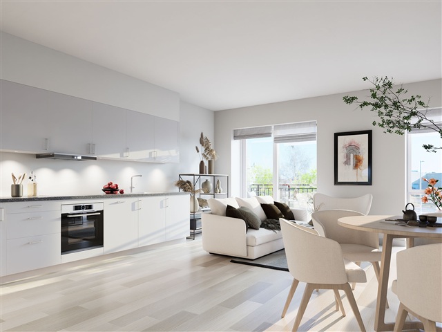 Located on the first floor, this bright and well-organized two-room apartment spans 72 m² and combines a contemporary open-plan layout with versatile interior design potential, featuring a delightful south-facing balcony.Upon entering, you are greeted by an open hallway that seamlessly leads into the spacious living area. The living room and kitchen share one generous and inviting space, where large windows allow natural light to fill the room throughout the day. The kitchen is efficiently arranged along one wall, providing ample countertop space, a dishwasher, and smart storage solutions.