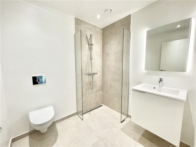 The bathroom is designed for functionality, equipped with a shower area, a stacked washer and dryer unit, and sufficient storage, making daily routines straightforward and comfortable.