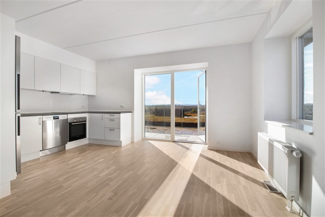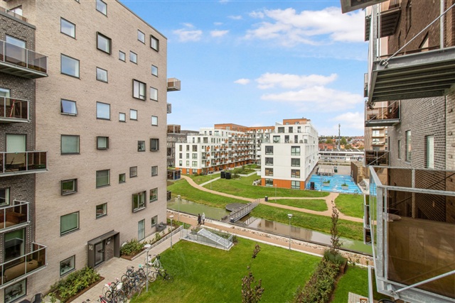 The overall layout emphasizes brightness and spaciousness. Windows are strategically situated to offer residents optimal views of the appealing green surroundings as well as the cityscape. Balconies in the building are designed and positioned to avoid casting shadows on one another, while still ensuring a high degree of privacy for each occupant. The shared green space between the buildings creates a cohesive environment and provides ample room for various outdoor activities in a large communal area. Additionally, Åbyskolen is conveniently located just around the corner.These well-planned apartments range from two to four rooms and feature a living room seamlessly connected to the kitchen and dining area. They are also suitable for roommates, which is particularly advantageous for students. All units benefit from abundant natural light and include spacious balconies or terraces boasting impressive views of both the city's skyline and the surrounding nature. Each apartment is equipped with its own washer and dryer in the bathroom. Residents have access to a storage room in the basement and can rent a parking space in the underground garage, while guest parking is available near the property.
