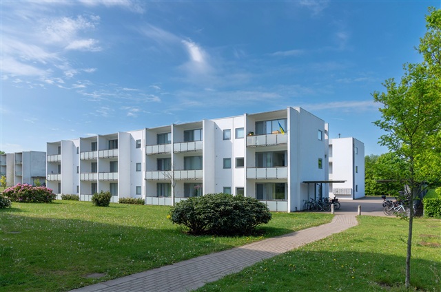 The building itself offers several amenities such as permission to keep pets, green communal areas, district heating, an elevator, covered bicycle parking, complimentary resident parking, and a large shared rooftop terrace with views.