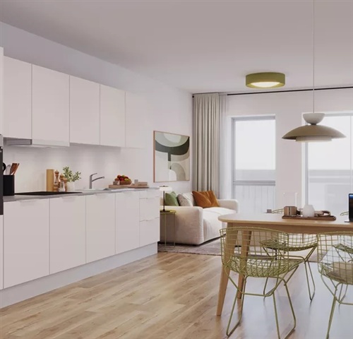 This charming two-room apartment offers an open living area combined with a private outdoor space. Please note that all descriptions, images, and floor plans are intended as guidance only.The kitchen and living room form a bright and spacious area, providing ample room for both a dining table and a seating arrangement. Positioned in a natural flow with the living area, the kitchen facilitates seamless daily life. It comes equipped with a dishwasher, an oven with a cooktop, and a fridge/freezer unit.