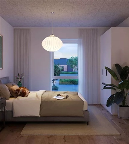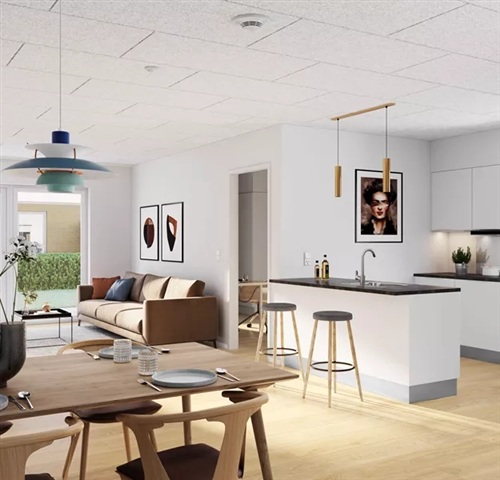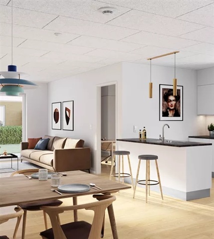 This charming five-room terraced house features a spacious and elegant kitchen-living area. Please note that all images, floor plans, and visualizations are for guidance only.The open-plan kitchen and living room combine functionality with style, centered around a kitchen island that offers additional workspace while seamlessly linking to the living area. The contemporary HTH kitchen is equipped with integrated appliances, providing an excellent environment for everyday cooking. The layout comfortably accommodates both a dining table and a lounge section, with direct access from the living room to the outdoor terrace.