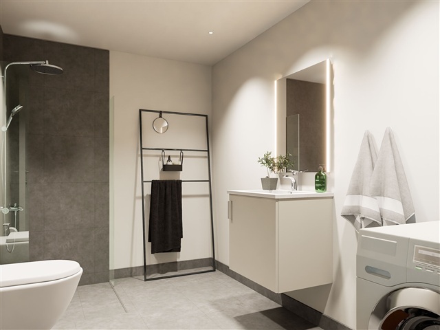 The bathroom is strategically placed and is equipped with a shower enclosure, a washer-dryer column, and practical features designed to support a functional and convenient everyday routine.