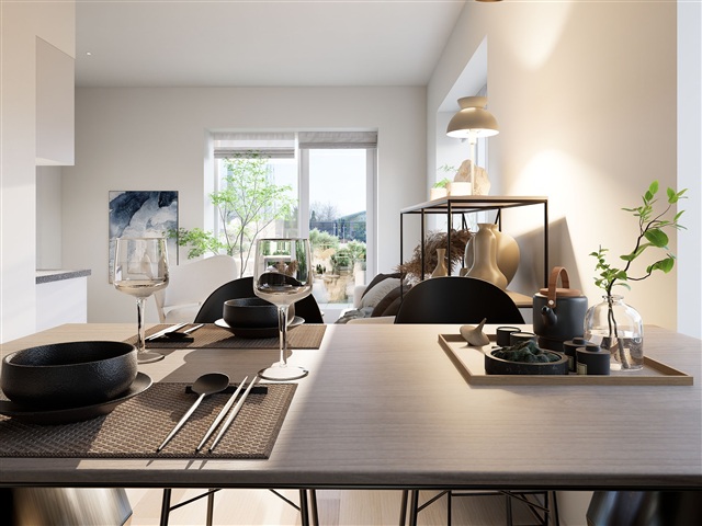 The living room and kitchen combine into one large, bright space where broad windows allow plenty of natural light to fill the area. There is sufficient room for a sofa, dining table, and personal decorative touches. The modern kitchen boasts ample countertop space, a dishwasher, and an efficient, linear arrangement.