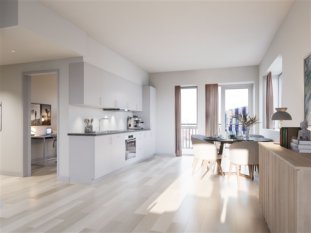 At the core of the home lies a spacious kitchen-dining-living area, where the kitchen is stylishly fitted along one wall, featuring generous countertop space, a dishwasher, and plenty of storage options. The sizeable living room comfortably accommodates both a dining section and a large seating arrangement, while expansive windows flood the space with natural light.