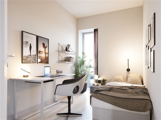 The apartment includes a large bedroom positioned to the north, providing a tranquil and comfortable environment with ample room for a bed, wardrobes, and even a potential workspace.