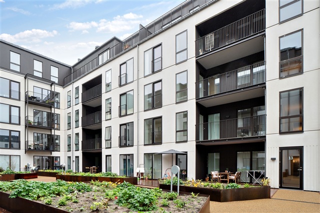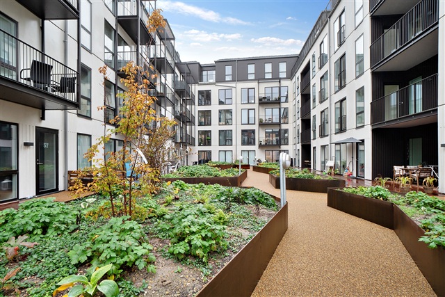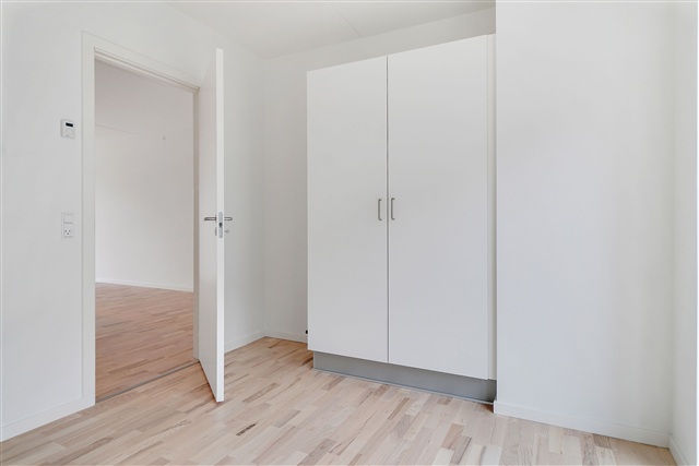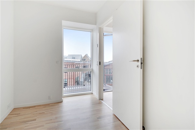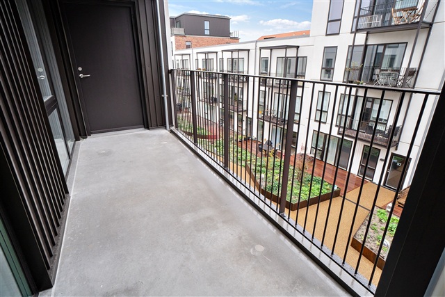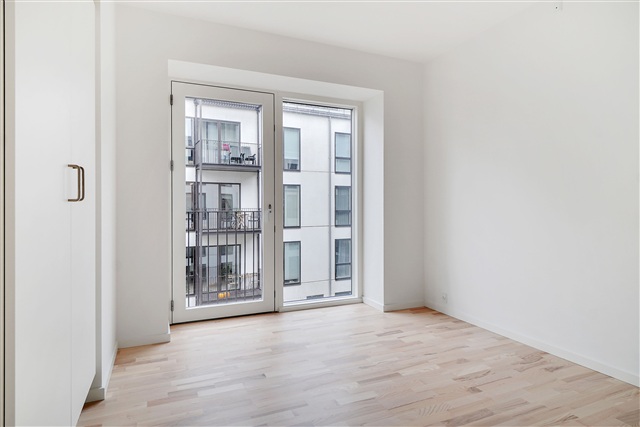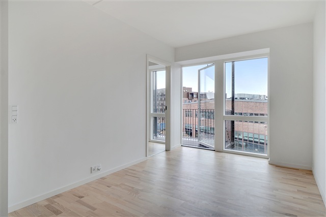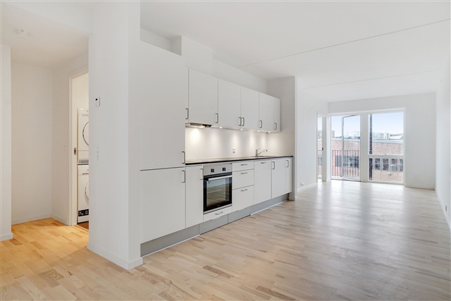 This newly constructed building is situated in the heart of Valby, housing a contemporary and elegant apartment. Offering an efficient layout combined with high-quality materials, the residence is perfectly suited for couples or small families. The structure's striking exterior features a brick facade complemented by metal panels on the top floor, lending the building a distinct, industrial character. Large window sections along with balconies punctuate the facade, adding visual interest and breaking up any monotony.Upon entering, you find a spacious hallway that flows openly into the main living area and includes a built-in closet for coats and outerwear. The bathroom is equipped with a shower enclosure and has sufficient room for a compact laundry station. The bedroom stands out due to its generous size and abundant natural light. Most of the apartment's square footage is dedicated to the bright and modern living space, featuring elegant flooring and impressive window walls. The kitchen is cleverly arranged along one side, making the open-plan living area a versatile space full of design opportunities. The living room is particularly inviting, with access to a practical storage room, a wide window, and a terrace door that opens onto a south-facing balcony overlooking the neighborhood.