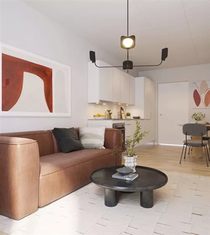 This charming two-room apartment features an open living area and a private outdoor space. Please note that all descriptions, images, and floor plans are indicative.The kitchen and living room combine to form a bright and inviting space, designed to comfortably accommodate both a dining table and a seating area. The kitchen is conveniently situated to create a harmonious flow within the room and comes equipped with a dishwasher, an oven with a stovetop, and a refrigerator/freezer.