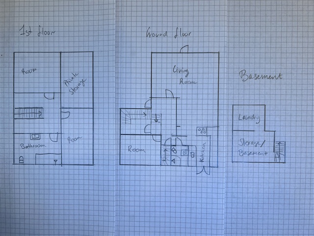 The first floor consists of a landing with a sofa and TV, two bedrooms, and a large bathroom with a big bathtub. A third bedroom will be used by us for storage.