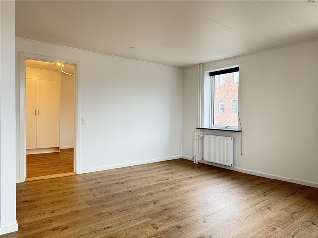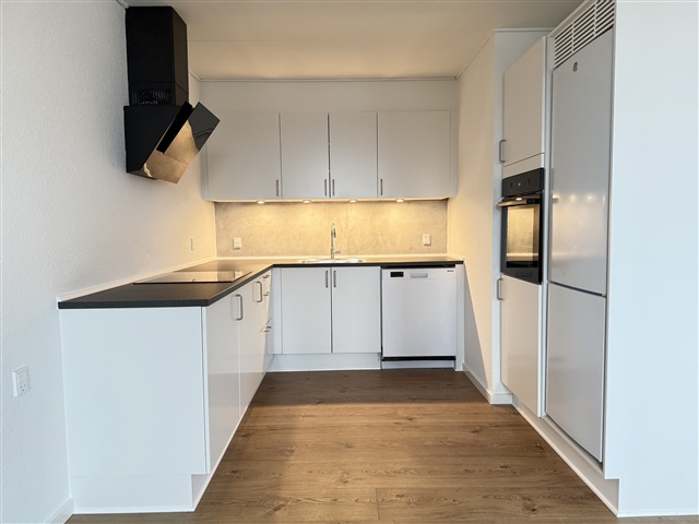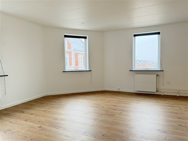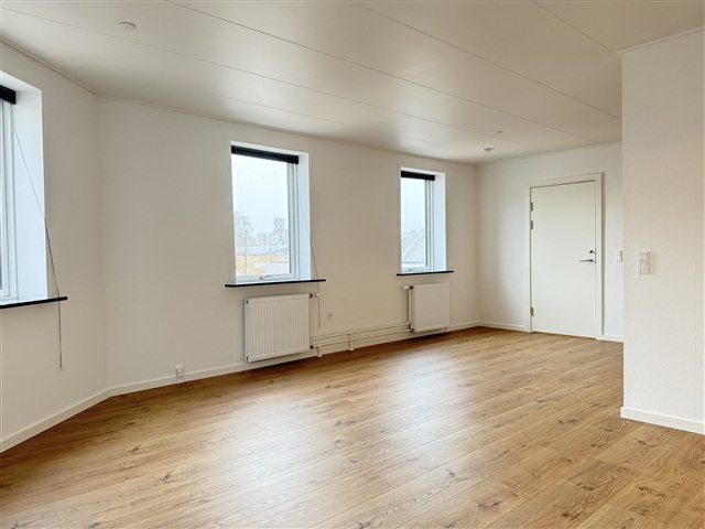 The apartment, located in the heart of Aalestrup, offers a bright and contemporary two-room layout spanning 55 square meters. Aalestrup, situated within Vesthimmerlands Kommune, is known for its blend of historic appeal and scenic natural surroundings. The town's character is strongly influenced by its past as a former railway hub, a heritage that remains visible in the distinctive architecture and atmosphere found throughout the area.Inside, the living room presents a generous space featuring warm-toned wooden floors and large windows that allow ample natural light to fill the room. Its modern design accommodates both a comfortable seating arrangement and a dining area. Adjacent to the living room is a newly fitted, open kitchen, equipped with white cabinetry and integrated appliances. The sleek dark countertop complements the kitchen's functional layout, which includes abundant storage space, creating an effortless flow between cooking and living zones.