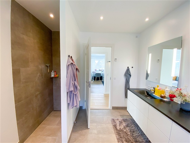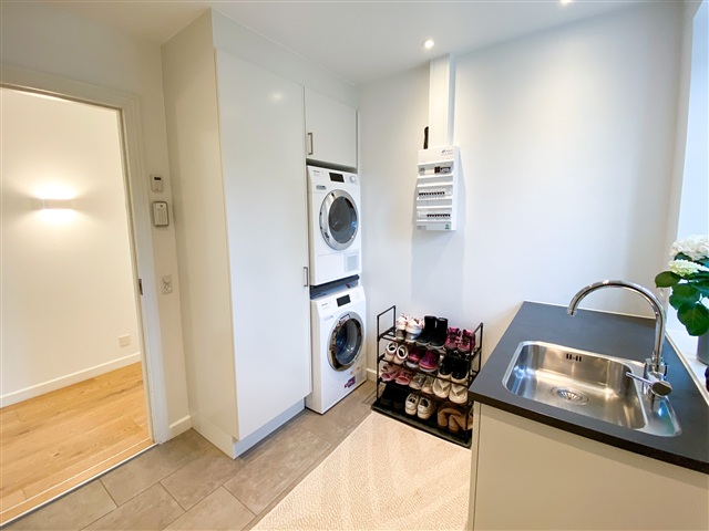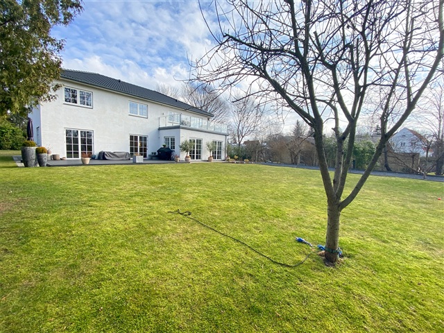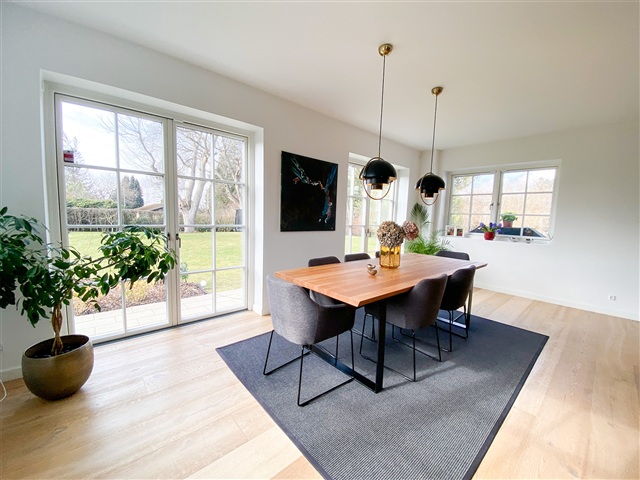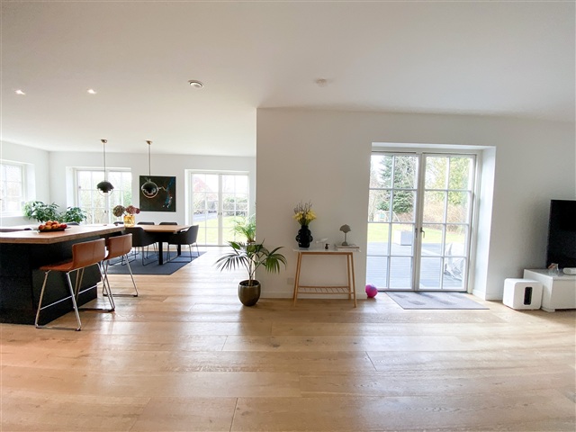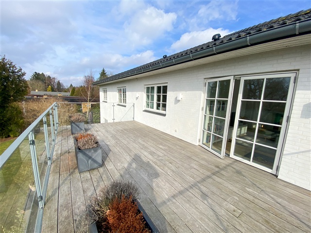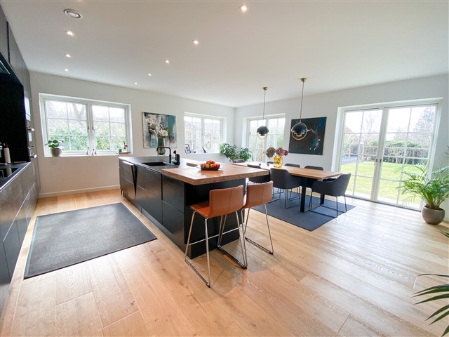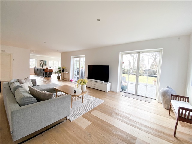 This impressive modern residence, completed in 2019, spans a generous 321 square meters across two full floors and is situated on a spacious, easily maintainable plot measuring 1,573 square meters. Combining the charm of palace-style architecture with contemporary comforts, the home features underfloor heating, three bathrooms, a master suite with a walk-in closet, and an electric vehicle charger installed in the double carport. Every detail is in place to enjoy a luxurious lifestyle in the heart of Holte.Inside, the layout includes an entrance hall with ample space for outerwear, two bedrooms equipped with built-in wardrobes, and a guest bathroom featuring a shower. A utility room with laundry facilities adds practical convenience. The centerpiece of the home is the expansive living room, which flows openly into the kitchen and dining area. Both living and kitchen spaces have access to the garden and a beautiful wooden terrace. Upstairs, a large landing opens onto a wide balcony or terrace, accompanied by three good-sized bedrooms with built-in storage, a bathroom with a shower, and a master bedroom suite boasting a walk-in closet and a spacious bathroom equipped with both a shower and a bathtub.