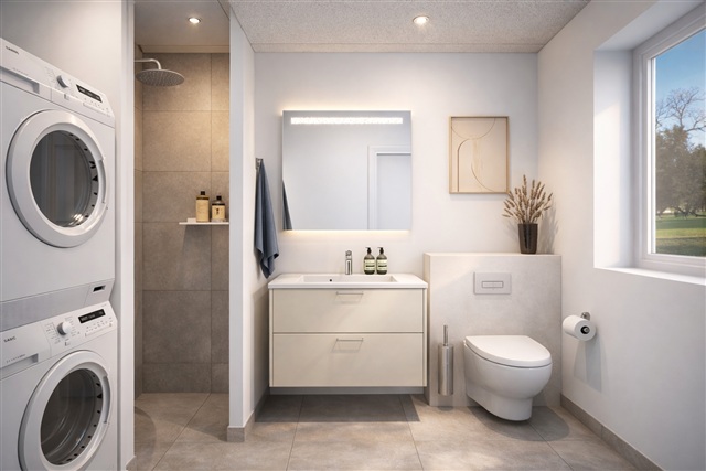 Building 3 consists of four appealing townhouses, each ranging from 100 to 103 square meters, designed with an emphasis on comfort, abundant natural light, and a practical layout. These homes are ideal for those looking for a bit more space alongside a residence that facilitates a smooth everyday flow. Each unit features three bedrooms, a kitchen outfitted with a skylight, one bathroom, and a convenient entryway equipped with both a washing machine and a dryer. The interior design prioritizes well-planned spatial connections and a natural cohesion between the various functional areas, resulting in a living space that feels both spacious and highly efficient.Residents have direct access from their homes to a west-facing terrace that invites enjoyment of the afternoon and evening sunlight in a peaceful setting. The presence of a green sedum roof contributes to the modern and harmonious aesthetic of these dwellings, seamlessly integrating them into the overall architectural design. Overall, the apartments within Building 3 offer generous room sizes, carefully considered features, and an inviting balance between utility and visual appeal.