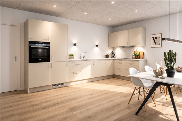 Building 4 comprises five thoughtfully designed single-story townhouses, each ranging from 80 to 83 square meters, tailored for those seeking a manageable and contemporary living space with well-considered, practical features. Every square meter has been carefully utilized to ensure the homes feel bright, functional, and comfortable. Each unit includes two bedrooms, a bathroom, and a convenient entrance area combined with a utility room equipped with a washing column. Additionally, there is a spacious kitchen/dining area featuring HTH fittings and a skylight. The layout is straightforward yet effective, focusing on everyday living where every element naturally integrates.The houses are constructed with vertical apartment dividers, reinforcing the sense of a genuine townhouse with a private atmosphere. The green sedum roof contributes to a calm and harmonious visual appeal that complements the overall architectural design. From the residence, residents access a wide terrace that seamlessly connects to the surrounding green spaces, providing a pleasant transition between indoor and outdoor areas and creating inviting settings for both relaxation and daily life close to nature.