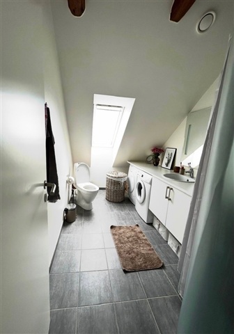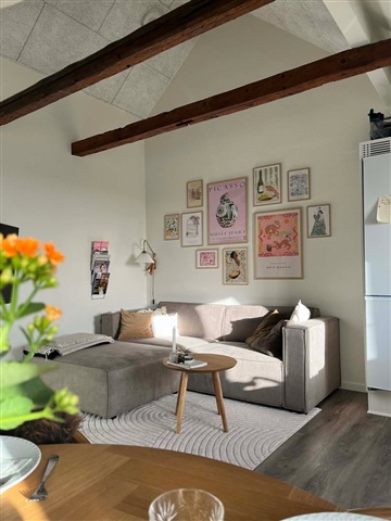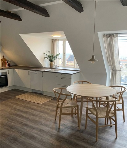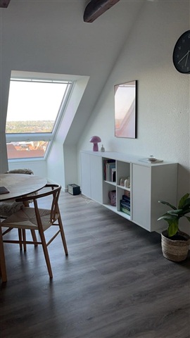 This ready-to-move-in apartment features two rooms spread over 62 square meters and is distinguished by charming slanted ceilings adorned with visible wooden beams. These structural elements, combined with large windows and skylights, create a bright and airy atmosphere throughout the day while providing pleasant views of the rooftops in the surrounding cityscape.At the center of the home lies an open-plan living area where the kitchen and lounge blend seamlessly. The kitchen, designed in a simple white finish, offers ample countertop and cupboard space, including an integrated oven and dishwasher. There is enough room to accommodate both a dining table and living area furnishings. The living room's durable wood-look flooring extends throughout, tying the layout together and providing an inviting space for a sofa and television setup.