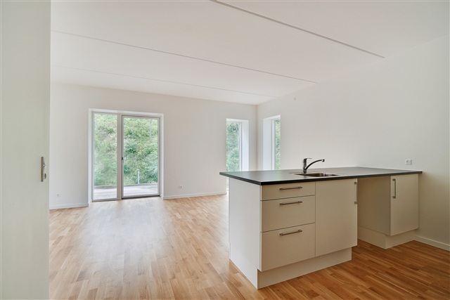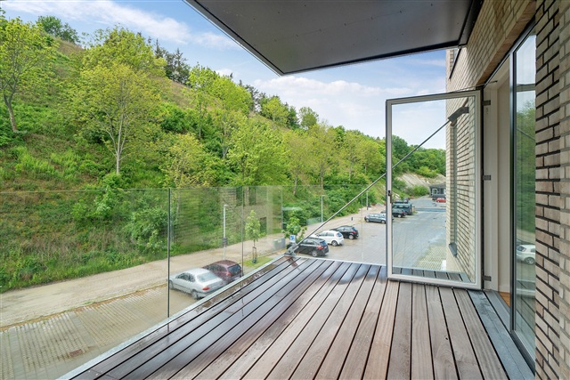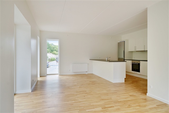 Situated in a tranquil setting, the residence provides easy access to the lively city environment. Kennedy Arkaden and Aalborg's city center are just a short five-minute bike ride away, offering numerous shopping options and dining venues. Surrounding the property are beautiful green communal spaces complete with playgrounds, enhancing the appeal for families and those seeking a balance between calm and convenience.
