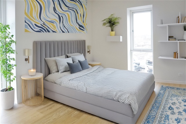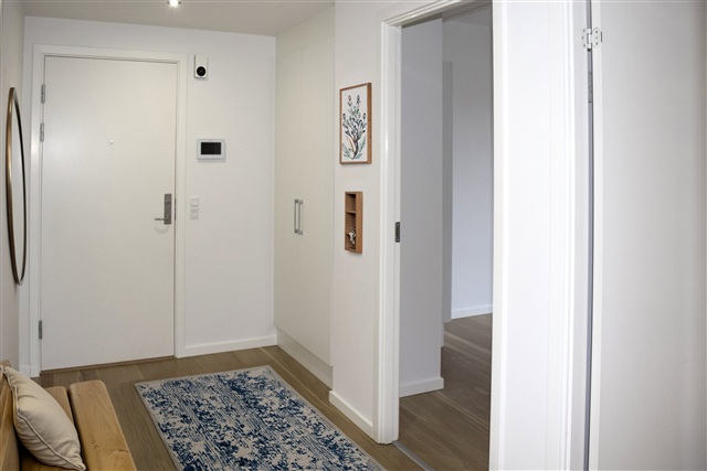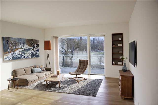 This apartment benefits from abundant natural light streaming in through both the south-facing balcony and the windows located in the gable end. The kitchen and living room are arranged in an open connection, enhancing the sense of space. From the living area, you can step out onto a spacious balcony facing south, measuring 9 square meters, which offers a pleasant view of the meandering Bygholm stream situated just below. This sizable balcony provides ample room to enjoy outdoor dining with family and friends.Inside, the apartment includes three bright bedrooms and a bathroom that accommodates a laundry column. One of the bedrooms is equipped with a large built-in wardrobe featuring sliding doors, providing generous storage for clothing. The building itself is fitted with an elevator serving all floors, including the basement, where you will find a storage room and bicycle parking.