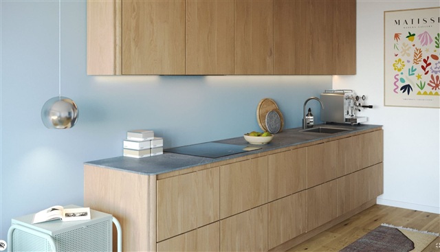 The apartment offers an open living space, where the kitchen and living room merge into a stylish and functional environment. The kitchen is from Køkkensnedkeren and is characterized by exclusive materials, clean lines and high finish.