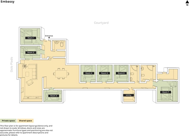 Built in 1901, this stately apartment building houses a top-floor unit offering stunning panoramic views of Copenhagen. The residence comprises seven rooms in total, including one double bedroom and six singles. There are three bathrooms available, two of which are equipped with showers, providing practicality and ease for multiple occupants. A standout feature of this home is the vast, open-plan space that seamlessly unites the kitchen, dining area, and living room. This layout fosters a highly social environment, allowing those cooking to easily engage with others relaxing in the living or chill-out areas. Adjacent to the kitchen, a modest balcony accommodates two people comfortably, perfect for savoring morning coffee while taking in the exceptional outlook.