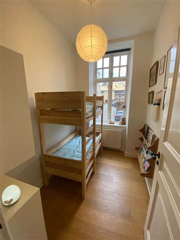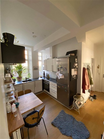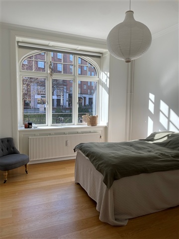 This apartment features notably high ceilings, elegant decorative moldings, and beautiful hardwood floors throughout. The kitchen opens directly into the hallway, creating a bright and spacious area. It comes fully equipped with a dishwasher, a refrigerator-freezer combo, a ceramic cooktop, and an oven. There are three well-sized rooms in total: two large bedrooms with charming windows that allow plenty of natural light to enter, and a smaller third room suitable for use as a child's bedroom or a home office. The bathroom is generously proportioned and bright, equipped with a shower enclosure.The building includes an elevator, bicycle storage facilities, and additional storage options. Heating is paid for via an advance payment, while water expenses are covered within the rent. Situated in the city center, this apartment enjoys an excellent location with easy access to various amenities including grocery stores, shopping malls, restaurants, and cafés. Public transportation is conveniently reachable, with a nearby bus stop providing straightforward travel options. A parking space can be rented for 1,200 DKK per month.