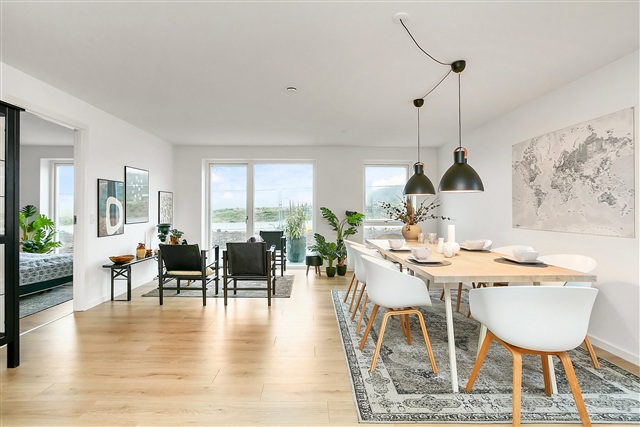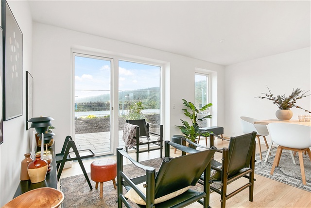 This inviting end-terrace house offers a spacious 104 m² of well-designed living space, thoughtfully arranged to combine practicality with a cozy atmosphere. The residence shines with natural light and a contemporary interior layout that maximizes usable space, making it an ideal home for couples, small families, or anyone seeking additional room in their daily life.Upon entering, you step into a generous hallway providing ample storage for coats and shoes. From here, two of the property's rooms open up, both filled with light and offering flexible usage options such as bedrooms, a home office, or creative spaces. Moving deeper into the home, the large, bright kitchen-living area serves as the central gathering spot. This open-plan space seamlessly integrates the kitchen, dining, and living zones, offering plenty of room for a dining table and comfortable seating. The kitchen features modern appliances and includes a functional island that adds workspace and casual seating. Expansive windows flood this area with daylight while creating a smooth transition to the outdoor garden.