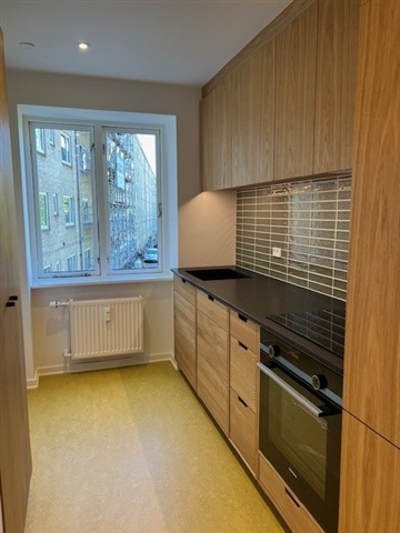 This renovated apartment features a distinctive kitchen outfitted with elegant oak cabinetry, drawers, and shelving, complemented by a built-in bench and table. The kitchen appears brand new and is fully equipped with a fridge/freezer, ceramic cooktop, extractor hood, built-in oven, and dishwasher. Both the living room and bedroom are generous in size, each providing access to a balcony.The bathroom is also well-presented, and the unit includes a washing machine and dryer. In the basement, there is space designated for bicycle storage as well as additional storage options. Residents also benefit from a charming communal courtyard area.