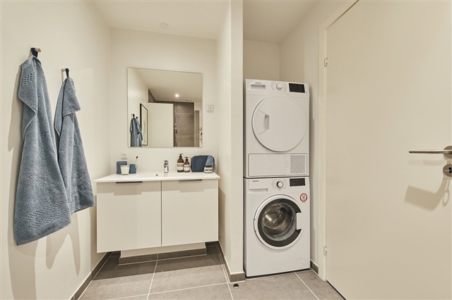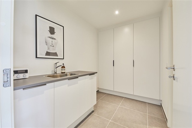 Attention to detail is evident throughout, with utility rooms furnished with countertops and sinks. The bathroom is conveniently connected to the utility room. The kitchen, bathroom, utility space, and master bedroom incorporate modern cabinetry with smooth white surfaces and anthracite-gray linear handles. Countertops are crafted from practical laminate in a rustic slate color, featuring spacious stainless steel sinks and a splashback behind the stove for easy cleaning. The bathroom includes a molded material sink, wall-hung toilets by Ifö Sign, premium fixtures from the German brand Hans Grohe, and linear drains in the shower area.