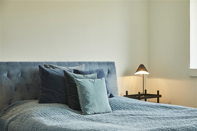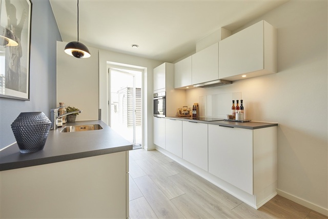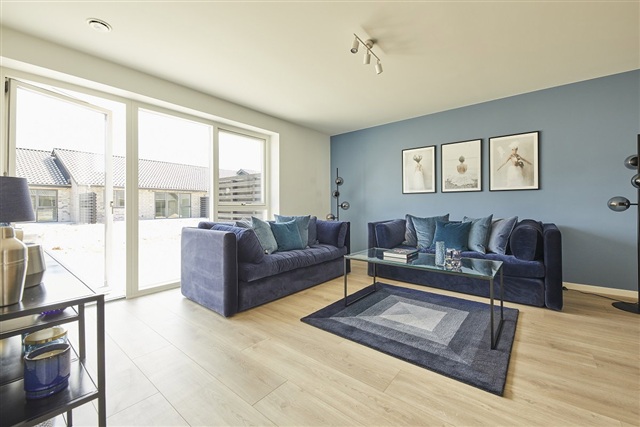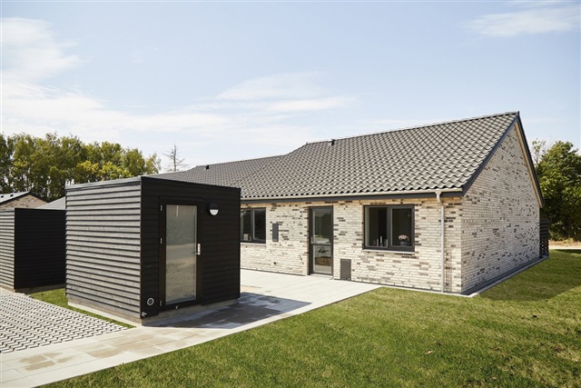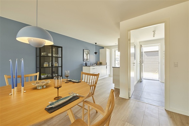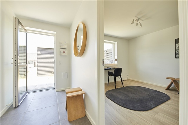 These homes are designed to maximize natural light, characterized by bright, airy interiors with smooth, white ceilings and walls. Large, operable windows throughout ensure excellent daylight penetration. The combined kitchen, dining, and living areas feature expansive windows on multiple sides to optimize light. Flooring consists of oak plank laminate in the kitchen, dining, living room, and bedrooms, while the entrance, utility room, bathroom, and shower incorporate high-quality, light gray tiled floors. All doors present a smooth white finish with stainless steel handles, free of thresholds to facilitate easy access. Window sills are constructed in masonry and the walls are finished in whitewashed plaster. Walls meet floors with neat, white, smooth baseboards.