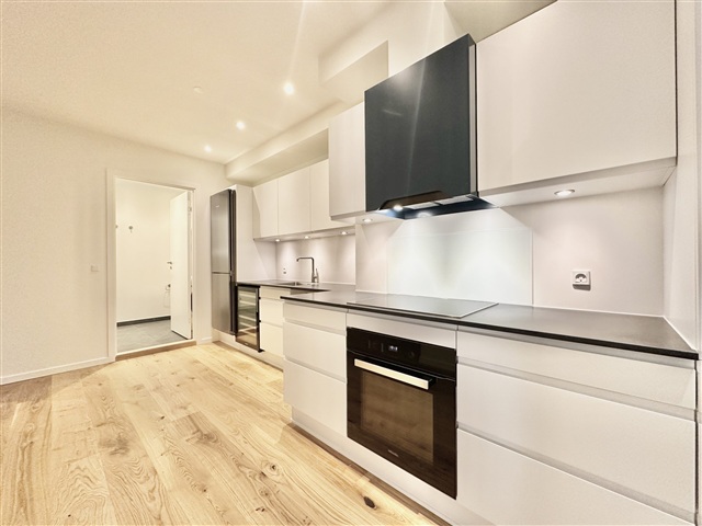 Leading from the entrance, there is an open-plan connection to an expansive kitchen-living area. The kitchen, crafted by Designa, is finished in elegant matte white and comes fully equipped with all major appliances, including a wine cooler. All household appliances throughout the apartment are from the brand Miele. The kitchen-dining space comfortably accommodates a dining table, and adjoining this area is a bright and pleasant living room that opens out onto a balcony.