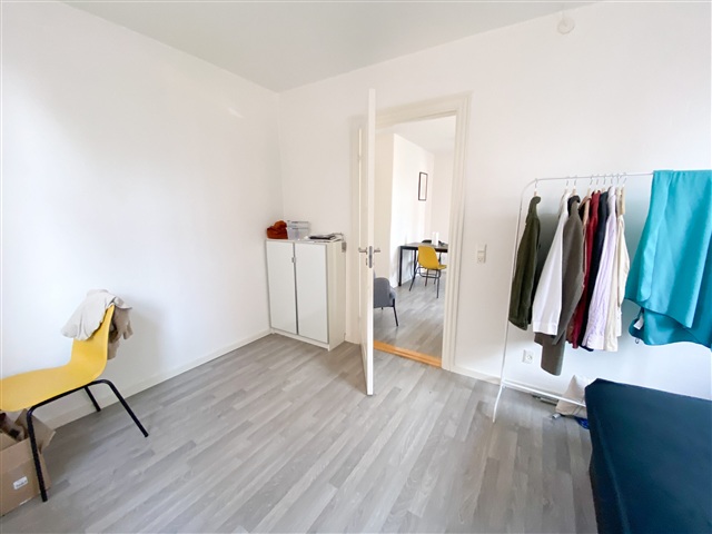 At the far end of the entrance corridor, a spacious room is found, large enough to accommodate a double bed, a desk, and a sizable wardrobe, making it well-suited as a bedroom.