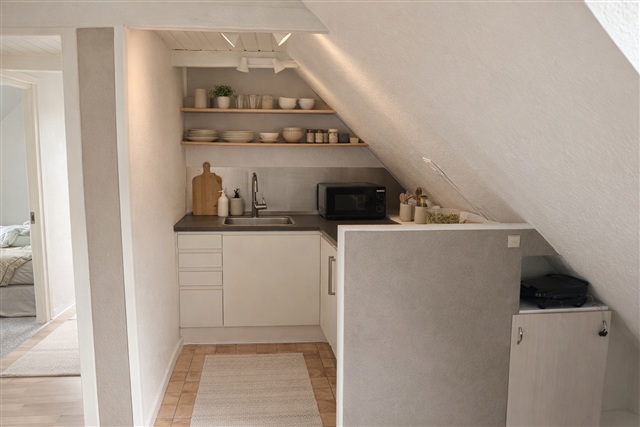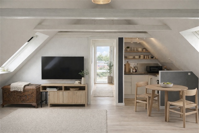 Situated on the first floor of a historic tailor's house dating back to 1928, right in the heart of Ølstykke stationsby, this two-room apartment offers a well-organized living space. Upon entering, there is a hallway providing access to a bathroom equipped with a shower and space for a washing machine. The apartment also includes a bedroom, while at the far end of the corridor you will find a combined living room and kitchen area.Each room is enhanced by charming skylights that allow for ample natural light. In the living room, exposed beams and a vaulted ceiling contribute to a spacious and airy atmosphere. Heating is provided by an air-to-air heat pump, with costs for electricity settled based on actual consumption. The electricity expenses are paid monthly as an advance alongside the rent, and final reconciliation happens with the landlord.