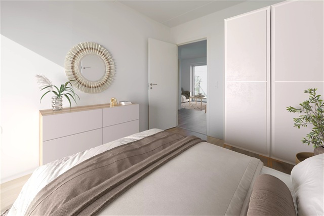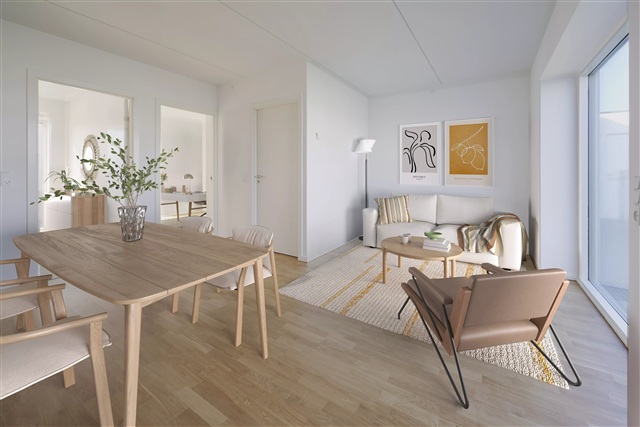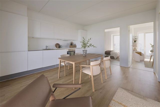 Situated just 7 kilometers from the heart of Aarhus, this attractive three-room apartment offers an ideal setup either for two friends sharing or for those seeking additional living space. The residence presents a contemporary and sleek aesthetic throughout.Inside, the apartment features an open-plan kitchen and living area, creating a spacious communal environment. The bathroom is both elegant and practical, equipped with built-in cabinets, a wall-mounted toilet, and a combined washer and dryer unit. There are two generously proportioned, bright bedrooms, each providing direct access to a large balcony. Underfloor heating extends throughout all rooms, enhancing comfort underfoot. Upon moving in, the apartment comes fully outfitted with all necessary appliances, including a dishwasher and the aforementioned washer-dryer combination.