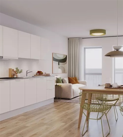 This charming two-room apartment features an open-plan living area along with a private outdoor space. Please note that all descriptions, images, and floor plans serve as guidance only.The combined kitchen and living room form a bright and spacious environment that enhances everyday comfort. There is ample room to accommodate both a dining area and a cozy seating arrangement, with the kitchen conveniently integrated within the space. The kitchen comes equipped with a dishwasher, oven with a stovetop, as well as a fridge-freezer unit.