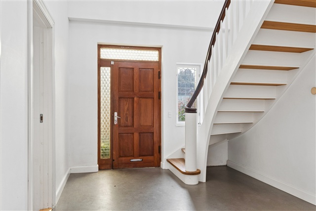 Leading on from the dining area, the house extends into a bright winter garden with large sliding doors opening directly onto a spacious wooden terrace overlooking the forest. Living in the middle of town while enjoying views of the forest is a rare feature. The living room is complemented by a wood-burning stove that provides warmth and a cozy atmosphere throughout the year. From here, there is also access to a sizable and atmospheric music room or library.