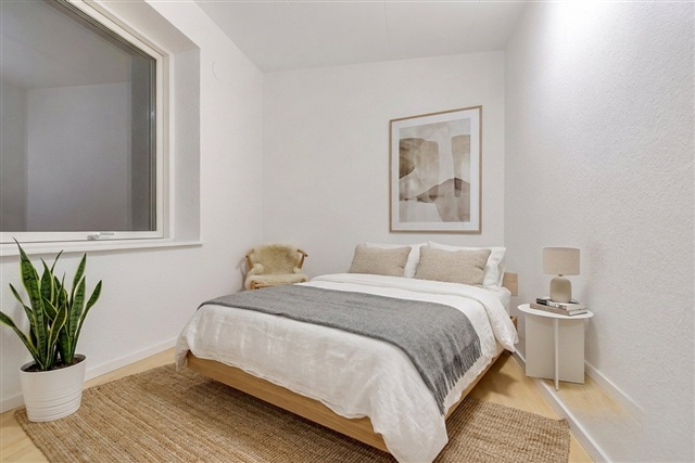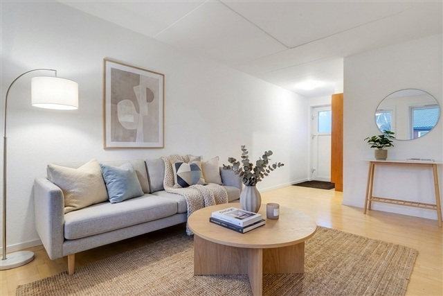 This terraced house is situated in a peaceful neighborhood, conveniently close to a bus stop, with a pathway system leading to Herning and nearby green spaces. The residence offers an open-plan living room and kitchen area. Additionally, there is a bathroom equipped with both a washing machine and a dryer, along with a bedroom featuring a built-in wardrobe. A storage room is included with the property. Utility expenses are paid directly to the suppliers.- Senior housing