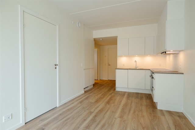 This attractive and inviting two-room apartment features a private balcony and is situated within a newly constructed residential complex. Inside, the layout includes an entrance hall, bathroom, a bedroom equipped with built-in wardrobes, and a bright, open kitchen and dining area. The unit is also fitted with a dishwasher and laundry facilities.The property enjoys a convenient location near SDU, various business hubs, and shopping options. Just a two-minute walk away, you will find the light rail station, providing frequent connections throughout Odense. At the center of the complex lies a pleasant green courtyard, which also contains a large communal terrace located above an underground bike storage area. A QR code included with the property images offers a virtual tour of this charming courtyard environment.