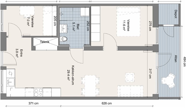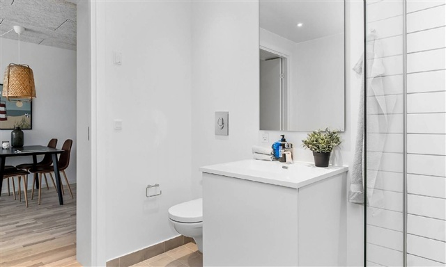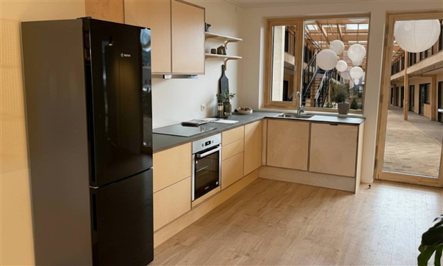 This three-room residence features a spacious corner kitchen that offers a delightful view of the atrium garden and the communal areas. The living room provides direct access to a generously sized private balcony, which also houses a personal storage room. The kitchen itself is a Danish-crafted custom design by Stykka, distinguished by its exclusive and bespoke character. Constructed from lacquered birch plywood, it harmonizes elegantly with the flooring, window frames, and wooden elements found throughout the apartment and the atrium. Within the hallway, a tailor-made bench of the same high standard is installed. The bedroom includes two white built-in wardrobes equipped with hanging rods and shelving. Additionally, the apartment has an extra room that can serve multiple purposes such as an office, hobby space, or guest room. Facing the atrium garden, there is a cozy front area perfect for enjoying a morning coffee near the community and greenery. This space invites personalization with a few pots, a narrow bench, or even a small metal café table set.Inside the apartment, the layout includes an entryway featuring a custom-built bench, a bathroom with ample space for a washer and dryer column, a bedroom equipped with two built-in closets, and an additional room suitable as an office or guest room. The kitchen is a bespoke Danish-made carpentry piece and comes fully equipped with a dishwasher, refrigerator with freezer, oven, and stove. The living area opens up to a private balcony that includes the resident's own storage unit.