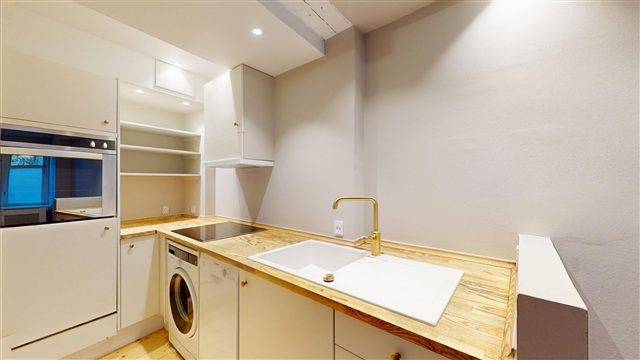 The apartment presents itself in a highly refined condition following a comprehensive renovation, with great attention paid to the choice of materials and functional design. At the heart of this residence lies the spacious, open-plan living area where the living room and kitchen blend seamlessly into one unified space. This creates a bright and airy environment, offering ample room for both relaxation and entertaining guests. The kitchen is equipped with a sleek, modern design and includes all essential appliances, such as a dishwasher and washing machine, enhancing convenience for everyday living.The bathroom has been completely refurbished to a high standard, featuring elegant details and a welcoming finish. In addition, the apartment includes a charming and cozy alcove that naturally divides the space and provides an ideal sleeping area without sacrificing the overall sense of openness. From the living room, one can step directly onto a delightful terrace that adds a unique dimension to the home. This outdoor space offers a rare urban retreat-perfect for morning coffee, peaceful moments, or relaxed evenings. The terrace's distinctive ambiance underscores the apartment's exclusive and uncommon appeal.