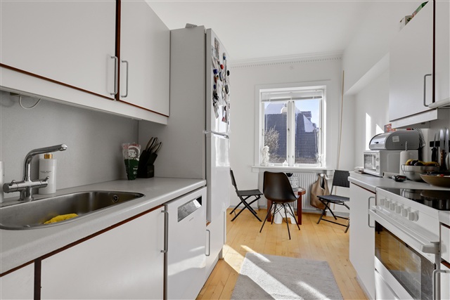 The kitchen, positioned separately, is designed for practicality with generous cabinet and countertop space, equipped with essential appliances including a dishwasher and oven. A small dining table can comfortably fit within the kitchen, making it convenient for everyday meals.