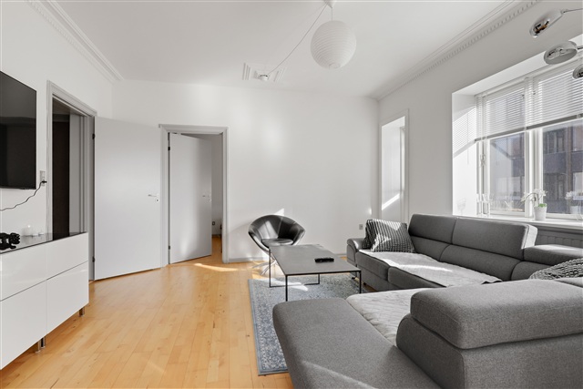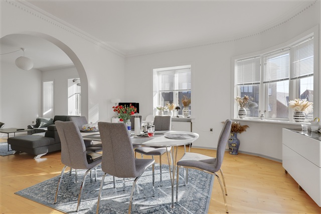 This welcoming apartment offers a thoughtfully arranged layout flooded with ample natural light. It radiates a bright and contemporary ambiance, featuring pale wooden floors, white-painted walls, and classic decorative molding, together creating a refined and timeless atmosphere.Inside, two spacious interconnected living rooms provide plenty of space suitable for both lounging areas and a dining setup. The large windows throughout these rooms invite abundant daylight, enhancing the pleasant and inviting feel of the living areas. A beautifully curved archway separates the two rooms, maintaining a sense of openness while allowing for a subtle division.