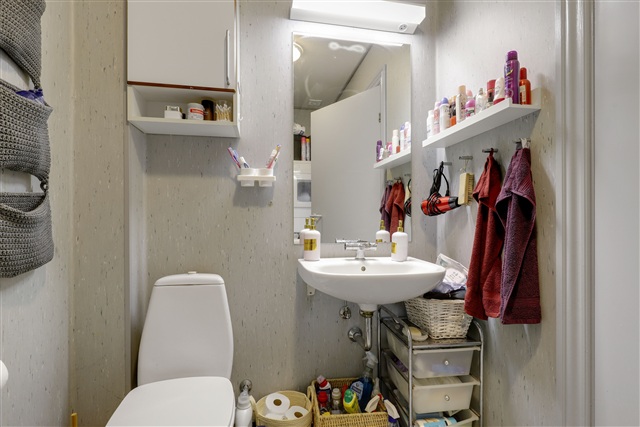 The bathroom is efficiently utilized, containing a separate shower cubicle, ample cabinet room, and includes both a washing machine and a dryer, adding everyday convenience.