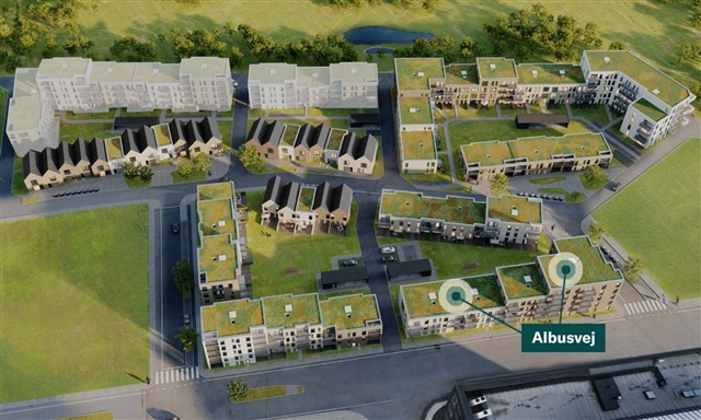 Situated in one of the architecturally distinguished buildings in Egedal's new neighborhood near the station, this residence enjoys proximity to urban conveniences while being surrounded by nature. The properties are enveloped by lush green lawns, and there is a dedicated bike shed available for secure bicycle parking.