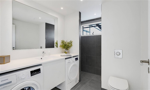 The apartments themselves feature thoughtfully designed layouts with a cohesive choice of materials throughout each space. They comprise two comfortable bedrooms, a bathroom fitted with shower, washing machine, and dryer, plus an open living area. Attention to detail is evident in the tasteful kitchen by Svane, equipped with Siemens appliances including a fridge/freezer, dishwasher, oven, extractor hood, and cooktop. Together, these elements create a refined living environment.