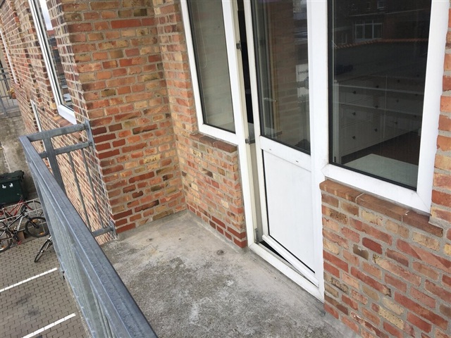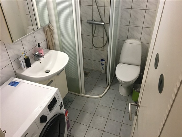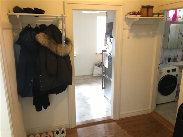The apartment features a spacious entrance area leading into a bathroom equipped with both a shower and a washing machine. There is a large kitchen that includes a dishwasher and enough room for a dining nook. The master bedroom is generously sized, offering built-in wardrobes and direct access to a balcony. Natural light fills the living room, creating a bright atmosphere. Additional details include wooden flooring throughout, a door phone system, and a cellar storage room. Parking can be arranged separately at a cost of 300 DKK per month.