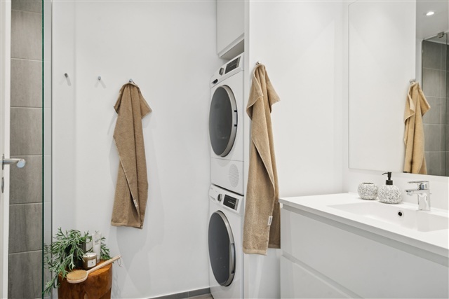 This apartment features an entrance hall equipped with ample storage space. Directly ahead, you will find the bathroom, designed with sleek, contemporary fixtures and including a stacked washer and dryer unit. On one side lies the bedroom, boasting a generously sized window that brings in plenty of light and comfortably accommodates a large bed. A substantial built-in wardrobe enhances practicality for new occupants. Adjacent to this room are two additional rooms, each fitted with a small closet; these spaces can serve as either extra bedrooms or home offices, among other uses. On the opposite side is the living room, which incorporates a modern kitchen complete with a dishwasher, as well as enough room for a dining table and seating area. The living area also provides direct access to a terrace facing south.Thors Have is a sustainable development where environmental preservation and biodiversity are prioritized. The complex consists of eight contemporary residential buildings, all certified with the DGNB Gold standard, emphasizing their ecological credentials.