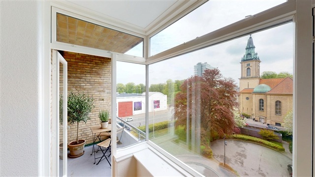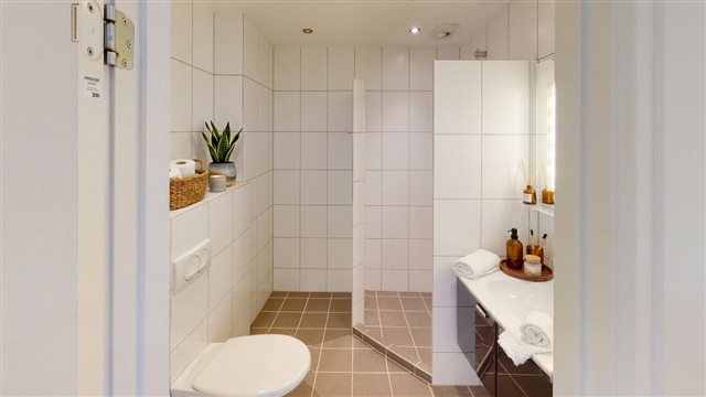 Upon entering the apartment, one immediately steps into the central hallway that connects the various rooms. The kitchen is modern, featuring black cabinet fronts and matching black tiles, equipped with a dishwasher and a large fridge-freezer unit. The bathroom is also newly renovated and well-maintained, offering a separate shower area, illuminated mirror, and storage cabinets beneath the sink. The rooms in the apartment are bright and spacious, each providing access to a charming balcony.