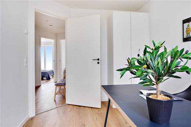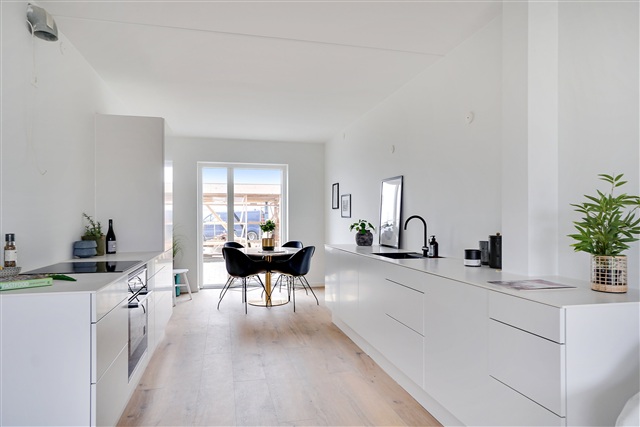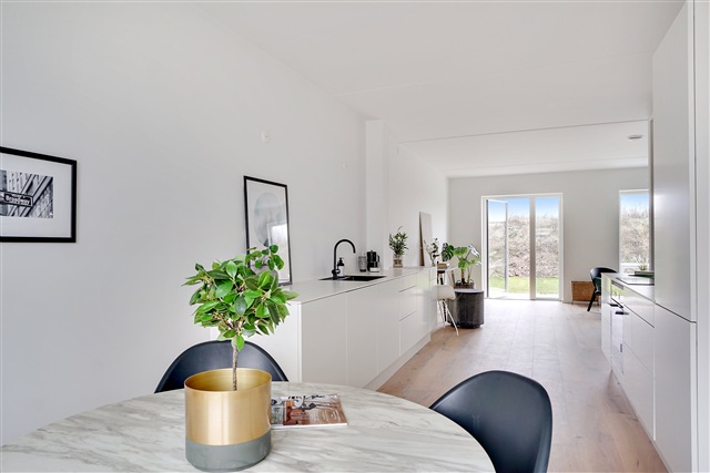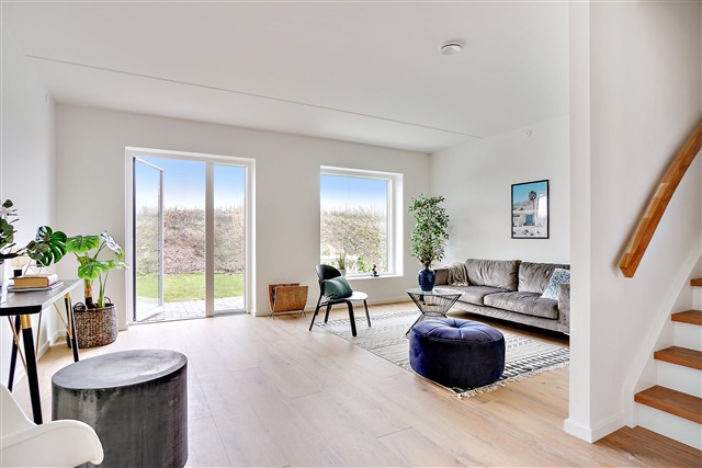 Situated in the thriving community of Tune, a satellite town near the Capital Region, this newly constructed architect-designed terraced house in Støberiet Tune offers a thoughtful combination of quality materials, functional layout, and appealing aesthetics. The residence spans two floors and includes a living room seamlessly connected to an open-plan kitchen, four bedrooms, and two bathrooms, complemented by two terraces positioned on opposite sides of the home. The address at Perlestensvej places you in a tranquil, family-friendly neighborhood within a rapidly evolving area of Tune.Residents benefit from well-maintained paths that encourage walking or cycling to various local amenities. Within a two-kilometer radius lie essential services such as Tune School, daycare facilities, shopping options, a sports hall, library, pharmacy, and the nearest bus stop. The property is also conveniently located about a fifteen-minute drive from both Roskilde and Greve. Inside the home, an inviting ambiance is created by abundant natural light, particularly emphasized in the spacious living area. Here, you can arrange a comfortable seating zone for relaxation alongside a dining space adjacent to the timeless kitchen, which features white, handle-free fronts. The ground floor includes a contemporary bathroom equipped with a tiled shower, white vanity unit, and space allocated for laundry appliances.