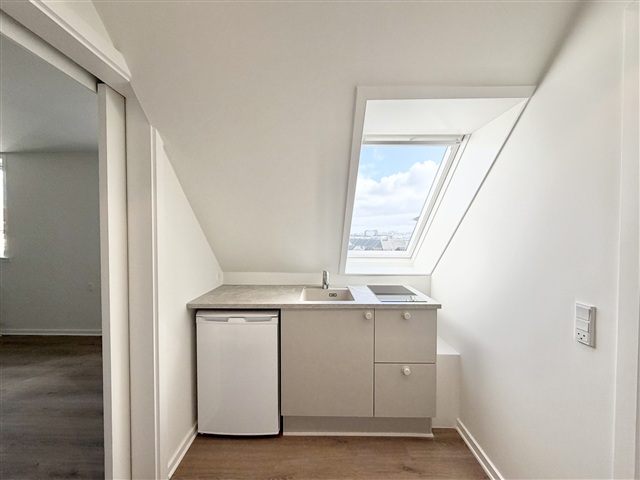 This one-room apartment combines abundant natural light with a contemporary design, situated in a central location in Nørresundby. The residence is ready for immediate move-in, offering a comfortable and inviting environment.The main living area is bright and thoughtfully arranged, blending practicality with sleek aesthetics. The kitchen, crafted by Designa, includes a cooking zone and refrigerator, facilitating an enjoyable cooking experience. Ample fixed cabinetry provides excellent storage capacity. The bathroom is newly renovated with high-quality fixtures from Grohe and Duravit, featuring a shower niche that enhances both function and style. The entire apartment reflects a fresh and modern ambiance following recent refurbishments.